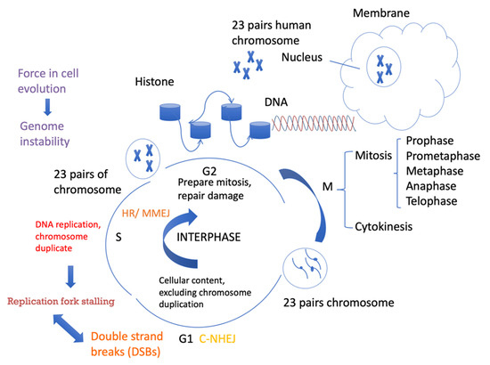 DNA double-strand breaks (DSBs) are the most toxic form of DNA damage. DSBs can occur due to both endogenously arising compounds, such as reactive oxygen species, and exogenous exposure to environmental factors, such as mutagenic chemicals and radiation [2]. To minimize the effect of this damage, cells have evolved various DNA repair mechanisms. Unfaithful repair of DNA DSBs leads to genome instability (GIN), in which cells may survive but generate genetic mutation, deletion, duplication, and/or the accumulation of chromosomal rearrangements [3]. The consequences of these events can lead to cancer, disease progression, and therapy resistance. Accurately repairing DSBs is important for cell division, and the progress is controlled during the whole cell cycle. Replication-associated DNA breaks can be generated in several ways, such as encountering a single-strand DNA nick, which results in the discontinued synthesis of nascent strands and leads to DSBs [4]. This event can occur due to replication stress-induced compounds, which is a different process from that of radiation-induced blunt ends of DSBs. If the nick is on the leading strand, the DSB would be one-ended and could promote the restart of synthesis by break-induced replication (BIR). BIR usually occurs after inducing a single-strand nick. Replication fork progression or leading-strand synthesis can be blocked, and leading-strand and lagging-strand synthesis are uncoupled [5,6]. A lesion blocks lagging-strand synthesis and creates an ssDNA gap or a DSB if the lesion is a nick. Lesions that block leading-strand synthesis can be bypassed by the replication fork, and replication can restart downstream and leave ssDNA gaps behind [5]. ssDNA gaps can be repaired by homologous recombination or error-prone translesion synthesis (TLS) [7]. Homologous recombination (HR) is one of the major pathways to repairing DSBs and mainly functions in the S phase, but it also functions in G2 and mitosis. It is initiated by DSBs but also addresses replication fork stalling-induced DSBs and acts as an alternative process for ssDNA gaps repair [8]. Compared with another major DSB repair pathway, NHEJ, which was thought as potentially error-prone for introducing insertions or deletions during the DSB end processing, HR was thought to be a “safer” repair option, which uses the exact same genomic information as a template for repairing the DSB [9]. A recent study suggested that the regulation of repair at stalled replication forks differs from that of a conventional DSB. Another pathway, single strand annealing (SSA), mediates error-free repair at stalled forks by suppressing tandem duplications at sites of aberrant replication fork restarts [10]. Different from the above pathways, canonical non-homology end joining (C-NHEJ) occurs throughout the cell cycle and repairs DSBs faster, but it is more active in the G1 phase [11]. There is still less evidence about microhomology-mediated end joining (MMEJ), which is also active in the S phase, and its role in replication fork stalling. Microhomology-mediated template switching processing of stalled replication forks is possible [10]. Recent studies have raised the central question of whether the replicative helicase CMG (CDC45-MCM2-7-GINS) participates in replication restart after fork collapse. A new study observed the fate of the replication fork after collision with strand-specific nicks. The CMG helicase is lost from the DNA but performs a different function with single-end DSBs. Short resection and gap fills occur on the leading strand [12]. Fen1, which is functional on MMEJ, participates in nascent DNA synthesis [13,14]. It has been revealed that the GINS complex (consisting of four proteins: Sld5–Psf1–Psf2–Psf3, and named for the Japanese “go-ichi-ni-san” [15,16]) molecules move at the leading edge of growing Fen1 tracts by imaging fluorescence Fen1 signal as nascent DNA synthesis [17], to demonstrate that GINS molecules travel with an active replication fork [12]. It is likely possible for ssDNA nicks to undergo short resection of the gap filled in by POLQ, which would mediate microhomology to repair bypass replication fork stalling. When DSBs occur in interphase, cells are able to arrest the cell cycle and repair breaks before entering mitosis. However, when DSBs occur during mitosis, the cycle can no longer be arrested, and cell division is completed instead of repairing the DNA damage [18]. These observations suggest that important factors involved in not only HR but also MMEJ participate in replication fork regulation. Future research could detect how the effect of MMEJ on the CMG complex triggers replication stress. In brief, the mechanisms of replication fork stalling and DSB repair are tightly related, and their interaction is essential for genome integrity and cell evolution (Figure 1).