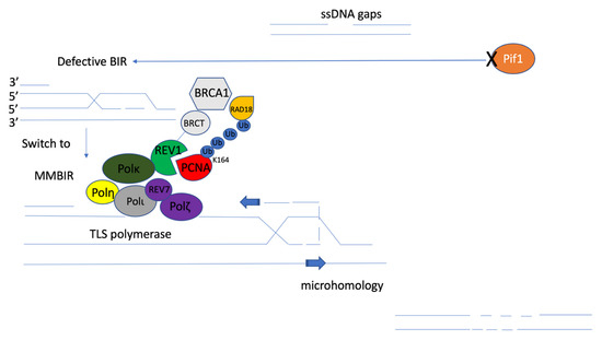 Proposed mechanistic model of microhomology-mediated break-induced replication (MMBIR). The disfunction of Pif1 helicase (orange) leads to template switches involving microhomology from defective BIR. MMBIR is driven by the translesion synthesis (TLS) polymerases Polζ and Rev1 [105]. Monoubiquitination of PCNA (red) on lysine 164 (K164) by RAD18/RAD6 (yellow) results in the binding of TLS polymerases to PCNA. TLS activities are mediated by REV1 (green) binding to PCNA through its BRCT domain (grey), and Polη (bright yellow), Polι (dark grey), Polκ (dark green), or the REV7 subunit of the Polζ (purple) complex through distinct C-terminal interaction surfaces through mutagenic repair of primpol-dependent ssDNA gaps [8]. That mutagenic repair could be microhomology-mediated repair, which will support the reestablishment of replication fork stalling and DNA damage lesion bypass.