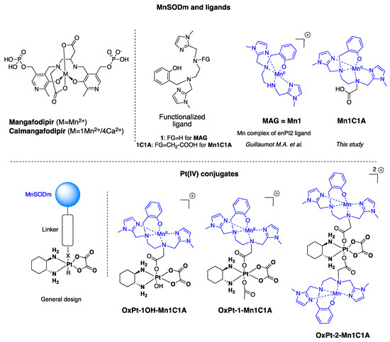 Structure of MnSOD mimics and Pt(IV) conjugates developed in this study. OxPt-x-Mn1C1A conjugates are Pt(IV) complexes combining oxaliplatin and Mn1C1A complex on axial position (MAG (Mn1) in association with oxaliplatin see [33]).