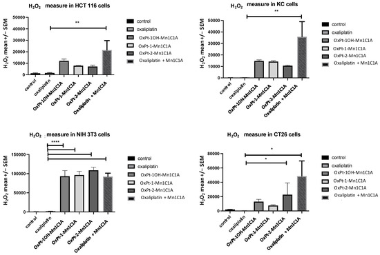 The Pt(IV) conjugates and Mn1C1A associated with oxaliplatin increased H2O2 levels in all cell lines. Figure 2 shows the mean H2O2 levels measured in HCT 116, CT26, NIH 3T3, and KC cells after treatment with the three Pt(IV) conjugates, oxaliplatin alone, Mn1C1A + oxaliplatin, or vehicle (at 2.5 μM, 5 μM, and 10 μM) for 24 h. In HCT 116 cells, treatment with Mn1C1A + oxaliplatin significantly increased the mean H2O2 levels (p < 0.01) compared to oxaliplatin alone with all tested concentrations. In CT26 cells, treatment with OxPt-2-Mn1C1A and Mn1C1A + oxaliplatin significantly increased the mean H2O2 levels (p < 0.05) compared to oxaliplatin alone with all tested concentrations. In NIH 3T3 cells, treatment with OxPt-1OH-Mn1C1A, OxPt-1-Mn1C1A, OxPt-2-Mn1C1A, and Mn1C1A + oxaliplatin significantly increased the mean H2O2 levels (p < 0.001) compared to oxaliplatin alone with all tested concentrations. In KC cells, treatment with Mn1C1A + oxaliplatin significantly increased the mean H2O2 levels (p < 0.01) compared to oxaliplatin alone with all tested concentrations.