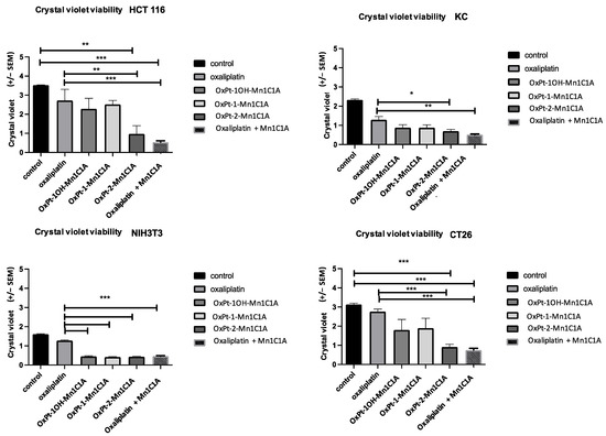 When grown to confluence, the different cell lines were treated with trypsin (Thermofisher®), counted, and seeded in flat bottom 96-well plates (Corning® New York, NY, USA). CT 26, KC, and HCT 116 cells were seeded with 105 cells/well, and NIH 3T3 with 5 × 104 cells/well. A decreasing range was determined for each cell line. After 24 h, experimental treatment was applied in triplicate with different concentrations: 2.5 μM, 5 μM, and 10 μM of oxaliplatin, Mn1C1A + oxaliplatin, OxPt-1OH-Mn1C1A, OxPt-1-Mn1C1A, OxPt-2-Mn1C1A, or control (culture medium). For primary fibroblasts, 104 cells per well were seeded, and the experimental treatment was applied after 48 h, with 2.5 μM, 5 μM, and 10 μM of oxaliplatin, Mn1C1A + oxaliplatin, OxPt-1OH-Mn1C1A, OxPt-1-Mn1C1A, OxPt-2-Mn1C1A and Mn1C1A alone, or control. For all cells, the treatment was removed from the well after 24 h and replaced by a cell medium. Cell viability was assessed 24 h later by crystal violet assay and read with UV spectrometry (Fusion, PerkinElmer). Data are presented as the mean results of all concentrations tested.