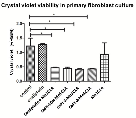 Cell viability assessed by crystal violet was also measured on a primary culture of murine fibroblasts (Figure 4). The Pt(IV) conjugates and oxaliplatin + Mn1C1A had significantly higher cytotoxicity on primary fibroblast culture cells than oxaliplatin alone. The MnSODm Mn1C1A alone was not cytotoxic on fibroblasts.
