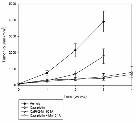 In the control group treated with the vehicle, tumoral growth was exponential. Mice treated with OxPt-2-Mn1C1A had significantly slower tumoral growth than the control group but significantly faster tumoral growth than mice treated with oxaliplatin alone (p < 0.05). The association of Mn1C1A to oxaliplatin did not affect oxaliplatin’s antitumoral activity. Mice treated with Mn1C1A + oxaliplatin had the same and highest tumoral response compared to OxPt-2-Mn1C1A and control.