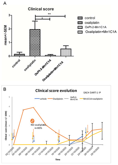 Mice treated with oxaliplatin alone had a high mean clinical score [4] after one intraperitoneal injection, and 80% could not receive the second injection due to weight loss of >20%. In the vehicle, OxPt-2-Mn1C1A, and Mn1C1A + oxaliplatin groups, each mouse received weekly injections. Figure 6A shows the mean clinical score during the whole experiment. Mice treated with Mn1C1A + oxaliplatin had a significantly lower clinical score showing better clinical tolerance of the treatment (p < 0.01) than mice receiving oxaliplatin alone with the same dose. Mice treated with the conjugate OxPt-2-Mn1C1A also had a significantly lower clinical score than mice treated with oxaliplatin alone (p < 0.05). Figure 6B shows the clinical score evolution over time.