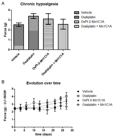 Mice treated with oxaliplatin + Mn1C1A showed significant less hypoalgesia induced by oxaliplatin than mice treated with oxaliplatin alone. The Von Frey test reflecting chronic hypoalgesia, with force (grams) necessary to induce paw withdrawal, was performed before treatment and during the whole experiment (Figure 7). Figure 7A shows the mean Von Frey score during the whole experiment in mice treated with the vehicle, oxaliplatin, Mn1C1A + oxaliplatin, and OxPt-2-Mn1C1A. In the Mn1C1A + oxaliplatin group, significantly less hypoalgesia occurred than in the oxaliplatin alone group (mean: 2.57 g vs. 3.95 g, p < 0.05). The difference between OxPt-2-Mn1C1A and oxaliplatin alone was not significant. Figure 7B shows the Von Frey score evolution over time (days). Mice treated with oxaliplatin had progressive chronic hypoalgesia with an increase in the force necessary to withdraw their paw. Mice treated with the same dose of oxaliplatin associated with Mn1C1A exhibited the same behavior as mice treated with the vehicle.