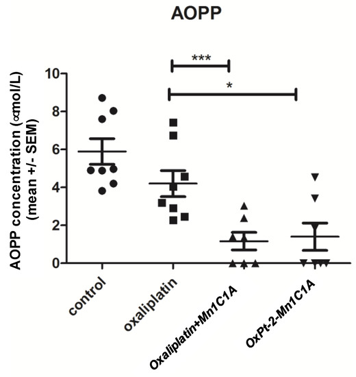 The mean advanced oxidation protein products (AOPP) level in mice serum was measured after sacrifice (Figure 8). Oxidative stress represented by seric AOPP was significantly lower in the Mn1C1A + oxaliplatin and OxPt-2-Mn1C1A groups than in the oxaliplatin group (p < 0.001 and <0.05, respectively), reflecting the MnSOD activity of the molecules.
