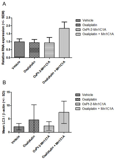 Figure 9B represents the autophagy marker LC3 measured in Western blot, showing a significantly higher production of the LC3 protein in the Mn1C1A + oxaliplatin group. There was no difference in SQSTM1 production among the groups.