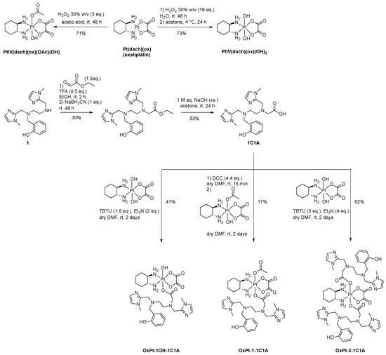 Synthesis of the 1C1A ligand and the three Pt(IV) conjugates before Mn coordination, which is performed in situ.