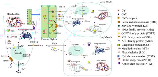 Plants improve their tolerance to Cu by transporting Cu ions into vacuoles or other organelles. Cu in the soil primarily exists in the form of compounds, namely Cu minerals, which form Cu+ and Cu2+ after weathering. Rhizosphere Cu2+ ions are reduced to Cu+ by the catalysis of ferric reductase oxidase 4/5. Cu2+ and Cu+ are transported into root cells by COPT1/2 and ZIP2/4, respectively, and then relocated to the mesophyll cells. Moreover, Cu+ from the external environment can be directly transported to leaf sheath cells by HMA and COPT [103]. In the cytoplasm, Cu+ is chelated by MTs or the two specific chaperones, CCS and ATX1, and transported to different organelles or sequestered in vacuoles to reduce the content of Cu in the cytoplasm. HMA4/5 and COPT5 control the transport of Cu+ from and into the vacuole, respectively, while HMA7 and CT1 (an MFS-type transporter) mediate the transport of Cu+ into the Golgi apparatus [103]. In mitochondria, COX17 in the intermembrane space delivers Cu+ to two chaperones, HCC1 and COX11, which are located on the inner mitochondrial membrane [104]. In fibrovascular tissues, Cu ions are transported in the forms of a Cu(I)-complex or Cu(II)-complex. ATX1 transmits Cu+ to HMA5, which loads Cu+ into the xylem. Complexed Cu2+ is transported into the leaves through YSL1/2/3 or reduced to Cu+ by ferric reductase oxidase 4 (FRO4), and Cu+ is then transported to the leaf cells by COPT6 [104]. Plastid Chaperone 1 (PCH1) and CCS are responsible for the allocation of Cu+ in the chloroplasts. PCH1 transfers Cu+ from the cytoplasm to the chloroplast membrane and then transports Cu+ to the Cu transporter HMA6 located in the inner membrane. HMA6 mediates the transport of Cu to the chloroplast stroma where Cu+ is bound by CCS and transferred to CSD2 and the Cu transporter HMA8, which is localized on the thylakoid membrane. Ultimately, HMA8 supplies Cu+ to plastocyanin in the thylakoid lumen [104,105] (Figure 1).