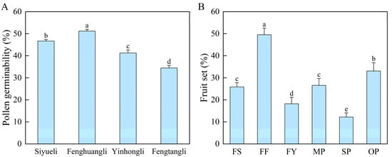 (A) Pollen germinability of four plum cultivars. (B) Fruit set rates of ‘Fengtangli’ plum with six pollination treatments. FS: ‘Fengtangli’ × ‘Siyueli’; FF: ‘Fengtangli’ × ‘Fenghuangli’; FY: ‘Fengtangli’ × ‘Yinhongli’; MP: mixed pollination; SP: self-pollination; OP: open pollination. Different letters above the bars indicate significant differences between treatments, p < 0.05 (the same below).