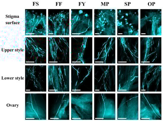 Fluorescence microscopic images of pollen germination and pollen tube growth of ‘Fengtangli’ plum with various pollination treatments. Scale bars, 100 µm.