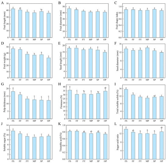 Fruit length (A), fruit diameter (B), fruit shape index (C), weight (D), seed length (E), seed diameter (F), pulp thickness (G), firmness (H), total soluble solids content (I), soluble sugar content (J), titratable acid content (K), and sugar-acid ratio (L) of ‘Fengtangli’ plum with different pollination treatments. Error bars indicate the standard deviation of total substance content, and different letters indicate significant differences in fruit characteristics, p < 0.05.