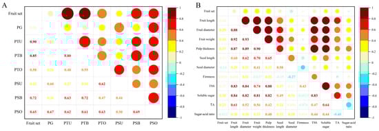 (A) Pearson’s correlation matrix between fruit set and reproductive parameters. PTU: number of pollen tubes at the upper third of style; PTB: number of pollen tubes at the base of style; PTO: number of pollen tubes penetrated to the ovary. PSU: percentage of pistils with pollen tubes at the upper third of style; PSB: percentage of pistils with pollen tubes at the base of style; PSO: the percentage of pistils with at least one pollen tube in the ovary. The values are statistically significant at p ≤ 0.05. (B) Pearson’s correlation matrix between fruit set and fruit characteristics.