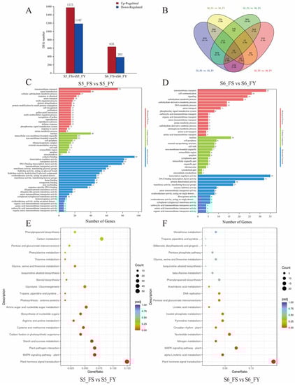 Differentially expressed genes (DEGs) in ‘Fengtangli’ plum from two pollination combinations. (A) Numbers of up-regulated and down-regulated DEGs of S5_FS vs. S5_FY and S6_FS vs. S6_FY. (B) Venn diagram of DEGs of S5_FS vs. S5_FY, S6_FS vs. S6_FY, S5_FS vs. S6_FS, and S5_FY vs. S6_FY. (C,D) GO enrichment analysis of DEGs of S5_FS vs. S5_FY and S6_FS vs. S6_FY. (E,F) KEGG pathway enrichment analysis of DEGs of S5_FS vs. S5_FY and S6_FS vs. S6_FY.
