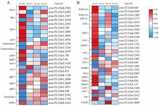 In the starch and sucrose metabolic pathways, a total of 25 DEGs were identified (Figure 7A; Table S7). Pollination of ‘Siyueli’ pollen significantly up-regulated the expression levels of sucrose synthase (SUS) (evm.TU.Chr8.2782), trehalose-6-phosphate synthase (TPS) (evm.TU.Chr1.3252), fructokinase (ScrK) (evm.TU.Chr1.3976), trehalose 6-phosphate phosphatase (ostB) (evm.TU.Chr1.747), beta-glucosidase (bglX) (evm.TU.Chr7.96), beta-fructofuranosidase (INV) (evm.TU.Chr3.473), glycogen phosphorylase (glgP) (evm.TU.Chr1.2971), and alpha-amylase (AMY) (evm.TU.Chr8.1412); there were opposite expression profiles in FY fruits. In contrast, pollination of ‘Yinhongli’ pollen up-regulated the expression level of β-glucanase (evm.TU.Chr5.1276), β-glucosidase (evm.TU.Chr1.1216), alpha, alpha-trehalase (treA) (evm.TU.Chr5.1193), glucose-1-phosphate adenylyltransferase (glgC) (evm.TU.Chr8.1130, evm.TU.Chr1.2060), starch synthase (glgA) (evm.TU.Chr3.2689), and β-amylase (evm.TU.Chr5.2103, evm.TU.Chr2.1736). The expression levels of these genes were down-regulated in FS fruits.