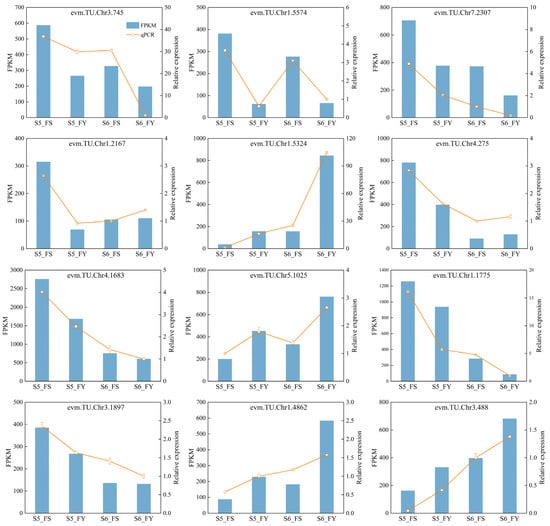 Real-time quantitative PCR validation profiles of twelve randomly selected genes from FS and FY fruits. The vertical bar indicates the standard error. The Y-axis on the left is the gene FPKM from RNA-seq (blue histogram). The y-axis on the right indicates the gene relative expression levels from the corresponding qRT-PCR analysis (orange line).
