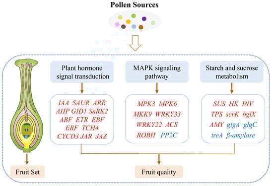 Physiological and molecular mechanisms by which different pollen sources affect fruit set and fruit quality in ‘Fengtangli’ plum. Red and blue colors indicate up- and down-regulation of gene expression in ‘Siyueli’-pollinated fruits, respectively.