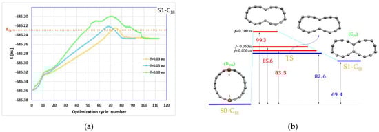The first S0-C18S1-C18 reaction (Figure 1a,b) is an elementary reaction with one transition state. This TS was found after relaxation (re-optimization without forces) of the stressed TS corresponding to the energy maximum on ARP obtained with the lowest EGO forces. The energy diagram is shown in Figure 1b. It can be seen that with external forces larger in magnitude, the corresponding ARPs are always higher in energy, all the way from S0-C18 to S1-C18 and they are very similar.