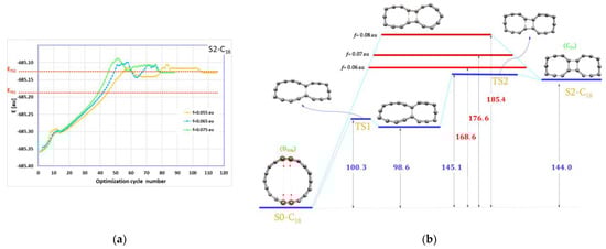 (a) The algorithmic reaction path (the geometry optimization history) with the marked transition state energy values; (b) the energy diagram with the estimated upper limit of the energy demand for the formation of the S2-C18 molecule. All values in the energy diagrams are in kcal/mol.