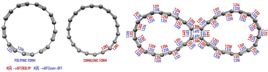 The bond lengths for the polyynic and cumulenic forms of cyclo[18]carbon and for its dimeric S0-C36 structure obtained at the DFT/B3LYP (red) and the DFT/user-DFT (blue) level.