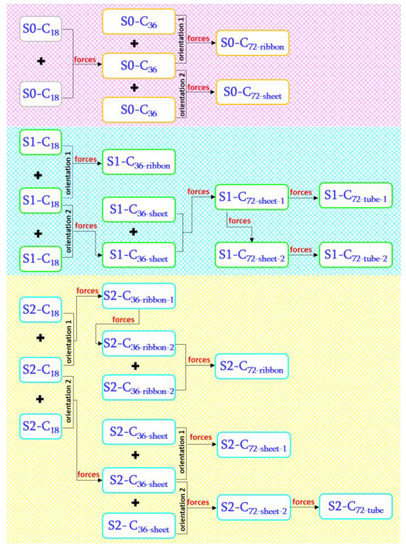 The energy diagrams, Figure 1b and Figure 2b, show that while the S1-C18 molecule should be relatively stable, the S2-C18 molecule with two C–C bonds will not survive and should transform back into starting S0-C18 in the essentially barrier-less process. Nevertheless, we used these two molecules together with S0-C18 to build up bigger units as shown schematically in Figure 4.