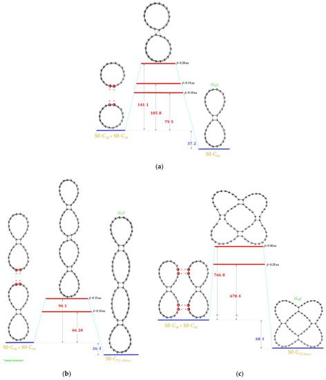 The energy diagram with the estimated upper limit of the energy demand for the formation of the (a) S0-C36 molecule; (b) S0-C72-ribbon molecule; (c) S0-C72-sheet molecule. All values are in kcal/mol.