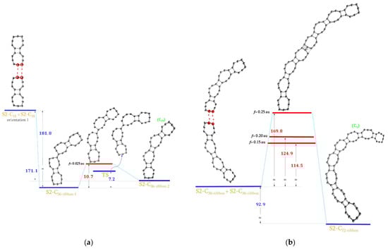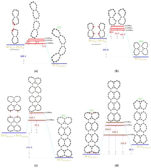 In an analogous manner, the S2-C36 and S2-C72 molecules were generated: S2-C36-ribbon-2 and S2-C72-ribbon as shown in Figure 7a,b, as well as S2-C36-sheet, S2-C72-sheet- 1 and S2-C72-sheet-2 shown in Figure 7c,d,e. Virtual reactions leading to these structures were quite complex. However, one reaction goes differently from others. So far, in all the virtual reactions presented here, the energy of a system was always first increasing when external pushing forces were applied to two reactants and then it was decreasing after the energy maximum was reached. In the case of the S2-C18 + S2-C18→S2-C36-ribbon-2 reaction, the energy first goes drastically down and the intermediate S2C36-ribbon-1 is created spontaneously. This structure corresponds to the energy local minimum. In this case, we were able to locate the transition state linking both S2-C36 ribbons. This is shown in Figure 7a. It can be seen that our estimated energy barrier of 10.7 kcal/mol (red) is quite close to the real energy barrier of 7.2 kcal/mol (blue). Much higher energy, up to 114.5 kcal/mol, is needed to generate the S2-C72-ribbon molecule as shown in Figure 7b.