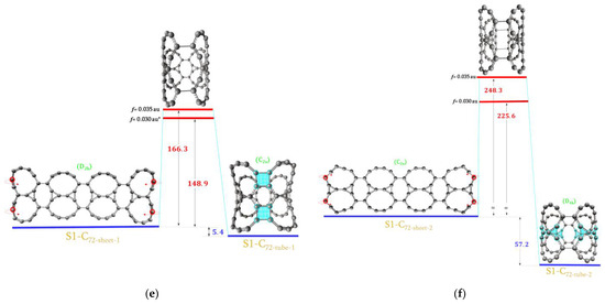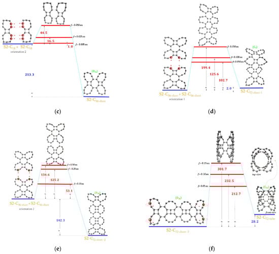 The energy diagram with the estimated upper limit of the energy demand for the formation of the (a) S1-C36-ribbon molecule; (b) S1-C36-sheet molecule; (c) S1-C72-sheet-1 molecule; (d) S1-C72-sheet-2 molecule; (e) S1-C72-tube-1 molecule; (f) S1-C72-tube-2 molecule. All values are in kcal/mol. * p < 0.05