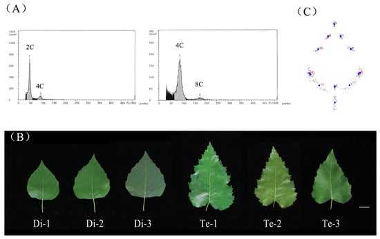 Phenotypic analysis of diploid and tetraploid birches. (A) Ploidy analyzer profiles of DAPI-stained leaf nuclei of diploid birch (left) and tetraploid birch (right). The x-axis indicates the fluorescence intensity of DAPI, which reflects the nuclear DNA content. (B) The 5th mature leaf of diploid and tetraploid birches, bar = 2 cm. Di, diploid. Te, tetraploid. (C) Leaf shape model by procrustes fit. Dots in blue represent the locations of 13 landmarks after matrix normalization, and numbers in red represent 1–13 landmarks.