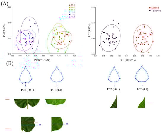 Overall, according to the PCA results, the morphological variation of diploid and tetraploid birch leaves accounted for 70.35% of the total morphological changes. The significant difference between diploid and tetraploid leaves of birch was mainly reflected in the leaf base.