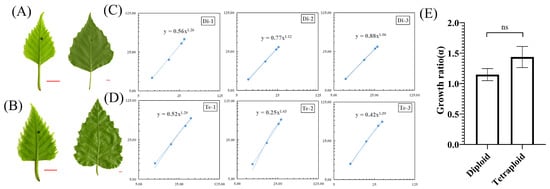 Leaves of different plants often show characteristic growth polarity patterns as they develop. In order to investigate the growth polarity patterns of diploid and tetraploid leaves of birch, we marked ink dots at the center of young leaves (Figure 3A,B) and substituted the regularly measured (xi, yi) into the formula to obtain the growth ratio (α) (Figure 3C,D). The results showed that α was greater than 1 for both diploid and tetraploid birch leaves. So the growth pattern of birch leaves was a positive allometric pattern of leaf base growth. The α of diploid birch leaves was 1.1477 ± 0.0996, and that of tetraploid birch leaves was 1.4344 ± 0.17504 (Figure 3C,D), indicating that the growth ratio (α) of tetraploid birch leaves was slightly more significant than that of diploid birch.