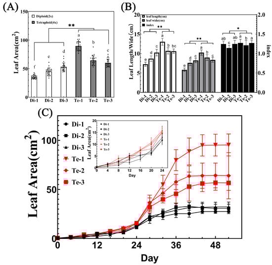 Leaf area analysis of diploid and tetraploid birches. (A) Leaf area of diploid and tetraploid birches, n = 26. Different letters denote statistically significant differences after one-way ANOVA. ** = p < 0.01 (paired Student’s t-test). (B) Leaf width, length, and index of diploid and tetraploid birches, n = 26. Different small letters denote statistically significant differences after one-way ANOVA. ** = p < 0.01, * = p < 0.05 (paired Student’s t-test). (C) Leaf growth analysis of diploid and tetraploid birches (n = 9).
