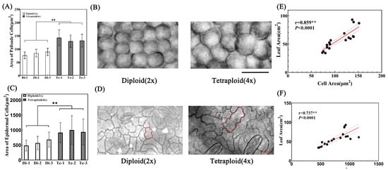 The results showed that the palisade cell area was larger in the tetraploid than in the diploid leaf. In addition, the difference in palisade cell area between the two species was very significant (Figure 5A,B). The average palisade cell area of tetraploid Te-1 was 1.87, 1.69, and 1.60 times of that of the three diploids, respectively. Furthermore, the average palisade cell area of the other two tetraploids, Te-2 and Te-3, was also more than 1.45 times that of the diploids (Figure 5A,B). Similarly, after observing the lower epidermis cells of the two species, it was found that the area of the lower epidermis cells of the tetraploid was significantly larger than that of the diploid (Figure 5C,D). The average epidermal cell area of tetraploid Te-2 was 2.07 times, 1.76 times, and 1.46 times of that of three diploids, respectively. The average epidermal cell area of Te-1 and Te-3 was more than 1.33 times that of the diploids. Therefore, it can be concluded that leaf cells of tetraploid birch had stronger cell expansion capacities than those of the diploid birch. Furthermore, there was a significant positive correlation between palisade cell area and leaf area, as well as between epidermal cell area and leaf area (Figure 5E,F), i.e., a leaf with a larger cell area had a larger leaf area. Therefore, increased ploidy level enhanced the birch’s cell expansion ability and enlarged its cell area, meaning that it is the main reason for the larger size of tetraploid birch leaves.