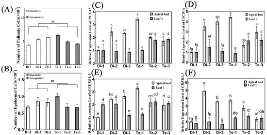 Number of leaf cells and relative gene expression levels of cell cycle-related genes. (A,B) The number of palisade cells (A) and lower epidermal cells (B) in diploid and tetraploid birch leaves, n = 6. ns = no significance (paired Student’s t-test). (C–F) Relative expression of PCNA1 (C), CYCD3;1 (D), CDKB1;1 (E), and CDKB2;1 (F) in the apical bud and first leaf of diploid and tetraploid birches, n = 3. Different letters denote statistically significant differences after one-way ANOVA.
