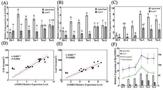 Analysis of the relationship between the expression of genes and leaf areas. (A–C) Relative expression of SWI3C (A), GRF5 (B), and ATHB12 (C) in diploid and tetraploid birches, n = 3. Different letters denote statistically significant differences after one-way ANOVA. (D) Correlation analysis between ATHB12 relative expression and cell area. (E) Correlation analysis between ATHB12 relative expression and leaf area. (F) A combined graph of the ATHB12 relative expression, cell area, and leaf area.