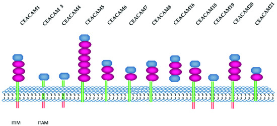 Schematic representation of human CEACAM isoforms. CEACAM belong to the immunoglobulin super family. They have at least one immunoglobulin-like domain Ig variable (IgV) and Ig constant (IgC). IgV and IgC are colored in blue and red, respectively, the cytoplasmic domain in orange and the GP-anchor in green. ITIM: immunoreceptor tyrosine-based inhibition motif. ITAM: immunoreceptor tyrosine-based activation motif (uniprot.org; proteinatlas.org) (accessed date 18 November 2021).