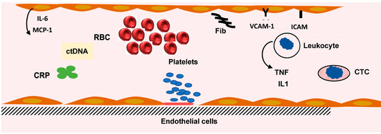 Inflammation and inflammatory markers. The defense mechanism involves leukocytes, platelets, and liver synthesis of proteins. The increase in fibrinogen (Fib) synthesis participates in the abnormal red blood cell (RBC) rheology and the increase in erythrocyte sedimentation rate. C reactive protein (CRP) blood level (pentamer) is increased. Several cytokine levels are elevated. Interleukin-6 (IL-6) is produced by endothelial cells (EC) and liver cells. Macrophage chemoattractant protein-1 (MCP1) is secreted by EC, tumor necrosis factor α (TNF), and interleukin-1β (IL1) by lymphocytes. The blood levels of cytokines are indicators of the inflammatory reaction induced by colorectal cancer. Circulating tumor cell (CTC) and circulating tumor DNA (ctDNA) can be measured in blood and used as an index of tumor progression.