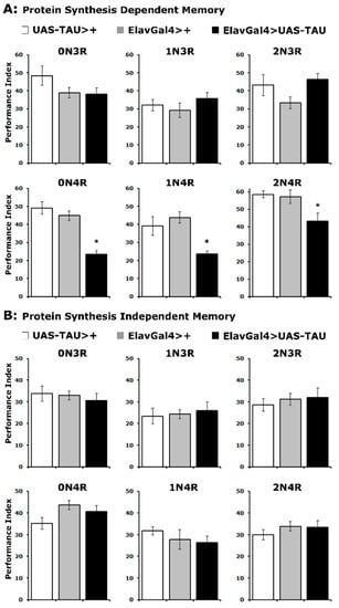 In agreement with the learning results, expression of all 4R isoforms resulted in significantly impaired PSDM, while accumulation of 3R isoforms did not affect this form of consolidated memory (Figure 3A and Supplementary Table S3). In contrast, PSIM was not affected by the accumulation of any hTau isoform (Figure 3B and Supplementary Table S3). These results are in agreement with prior reports [22,32,33] and expand them to include all hTau isoforms. Importantly, the specificity of consolidated memory defects to PSDM for all 4R isoforms is consistent with the interpretation [37] that hTau excess of these hTau species in the fly CNS impairs translation-related processes required for PSDM [29,36]. Furthermore, these results strongly support the notion that the severity of learning and memory impairment is not proportional to hTau levels (Figure 1) or the mild reduction in MB size (Figure 2A), but rather correlates with the number of microtubule-binding repeats.