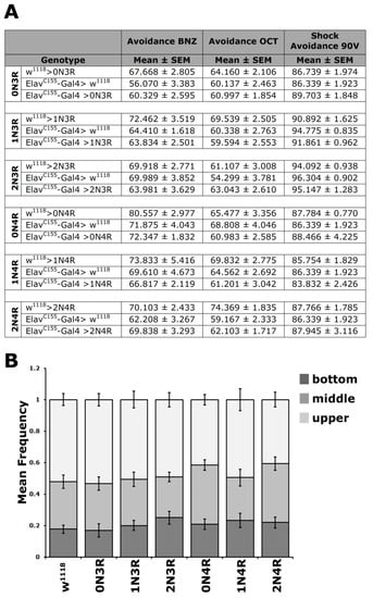 As an added pertinent control, since flies have to move to different arms of the choice maze and impaired movement might appear as reduced cognitive performance, locomotion was assessed in hTau-expressing animals. To increase resolution, the task was made more demanding by assessing innate locomotor behavior based on negative geotaxis (climbing). When tapped to the bottom of a vial, flies will attempt to escape by climbing to the top, and the assay has been used to demonstrate locomotor dysfunction in aged tau-expressing animals [22,38,39]. As shown in Figure 4B, the climbing ability of the relatively young hTau-expressing animals used in all our assays was not significantly different from controls (Supplementary Table S4). Collectively, these results indicate that pan-neuronal hTau accumulation does not precipitate deficits in sensory modalities requisite for olfactory conditioning.