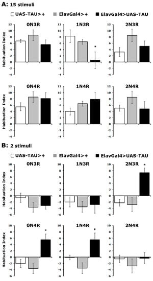 hTau isoforms affect differentially habituation to footshocks. Habituation following exposure to 15 (A) or 2 footshocks (B) of flies accumulating pan-neuronally the indicated hTau isoforms (black bars) compared with driver and transgene heterozygotes (grey and white bars). The means ± SEMs are shown for n ≥ 7 for all genotypes. Stars (*) indicate significant differences from both controls. Statistical details in Supplemental Table S5.