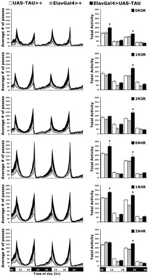 Circadian behavioral deficits, such as increased night-time wakefulness and increased daytime sleep, are common in Alzheimer’s disease and related tauopathies [42]. Flies exhibit daily cycles of activity and inactivity, a behavioral rhythm that is governed by the animal’s endogenous circadian system [43]. To investigate how the six hTau isoforms affect circadian behavior, we expressed them pan-neuronally and monitored locomotor activity under a 12 h light-dark (LD) cycle. As expected, the activity profiles contained morning and evening activity peaks, centered around the light transitions (lights on and off), separated by a midday siesta and a period of sleep during the night (Figure 6 left panel).