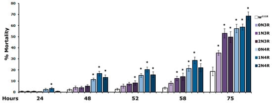 Mortality of hTau-expressing flies was significantly increased as early as 24 h of exposure to 5% H2O2 and presented a steady significant increase over controls over the duration of the experiment (Figure 7, and Supplementary Table S7). Importantly, flies expressing the three 4R isoforms presented significantly enhanced susceptibility to oxidative injury as they started to expire much earlier than those expressing 3R isoforms (Figure 7, 24 h and 48 h and Supplementary Table S7). Moreover, hTau2N3R- expressing animals appeared more vulnerable to H2O2 than those expressing hTau1N3R (Figure 7, 52 h and 58 h and Supplementary Table S7). In contrast, flies expressing the hTau0N3R isoform were the most resistant since compared to controls, they presented statistically significantly higher mortality only upon treatment for 75 h (Figure 7 and Supplementary Table S7, 75 h). Clearly, therefore, vulnerability to H2O2 toxicity correlates well with the number of microtubule-binding repeats, but not with protein abundance in the fly CNS.