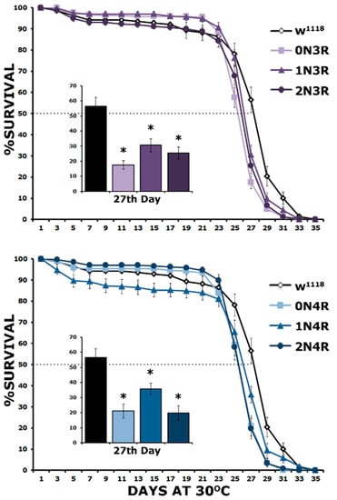 The survival of these hTau isoform-expressing flies was monitored until they all expired. As demonstrated in Figure 8, all hTau isoforms presented statistically significant shortened lifespans compared to controls (Supplementary Table S8). This is evident both in maximal survival, which was 35 days for controls and 31–32 for hTau-expressing flies and their 50% attrition date, which was day 25 for hTau-expressing flies and day 27 for controls (Figure 8). The attrition measure refers to the date when 50% of the population of a given genotype expires and is presented at day 27 in the inserts in Figure 8 for clarity. Clearly, the expression of all hTau isoforms results in a statistically significant survival decrease on this day (Supplementary Table S8). These results are congruent with those of Fernius [25], who concentrated only on the maximal survival day and expanded them by incorporating survival measures at the 50% attrition day, which offers an increased resolution of the toxicity phenotype. Importantly, there does not appear to be a correlation between the premature mortality of hTau-expressing animals and the level of the particular isoform accumulating in their CNS, indicating equal toxicity for all 3R and 4R isoforms.