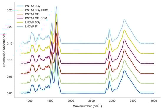 In this study Fourier transform infrared (FTIR) microspectroscopy (FTIRM) was used to analyse these effects in a prostate model in vitro, for which radiobiological results have previously been reported elsewhere []. Spectral analysis of an experiment in which a simulation of intercellular communication between irradiated prostate tumour cells (LNCaP line) and cells of the surrounding normal prostate tissue (PNT1A line) is conducted, where communication between the cells is both prohibited and permitted. In the experiment conducted by Shields et al. []. LNCaP cell lines were irradiated with X-ray doses of 2 Gy (labelled as LNCaP IF (in-field) in this instance). The PNT1A cells were then exposed to the medium from the LNCaP cells with or without a prior exposure to a low dose of ionising radiation (0.2 Gy) which simulates the effect of direct exposure of the normal tissue adjacent to tumour in prostate cancer treatment.