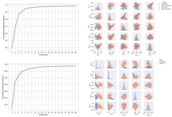 Principal components analysis of (top panel) PNT1A cell line and (bottom panel) LNCaP cell line spectra. In each panel the left figure displays the cumulative explained variance and the right displays a pairs plot of the principal component scores for the first 5 principal components.
