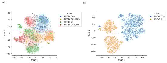 Representative t-SNE scores plots for (a) PNT1A cells exposed to a range of treatment modes and (b) LNCaP cells exposed to 2 Gy (IF) and 0 Gy (Control).