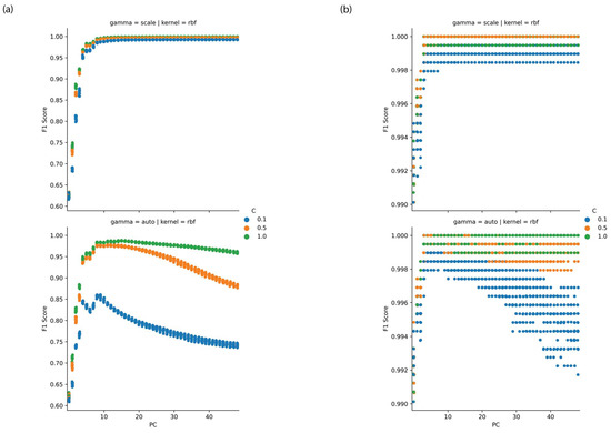 Performance of PCA-SVM versus principal component for (a) PNT1A and (b) LNCaP cell lines with variation in SVM hyperparameters.