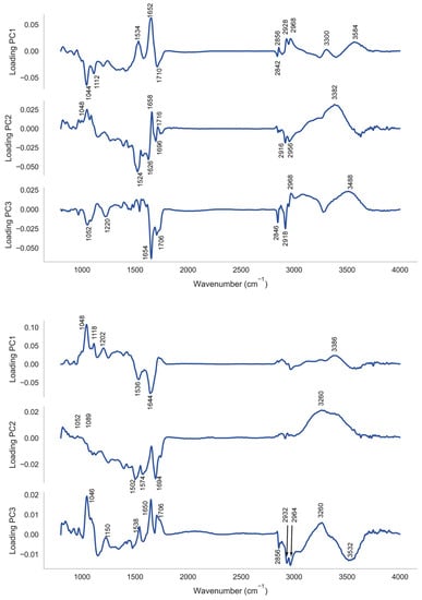 In the case of the PNT1A cell line loadings to vibrational modes of nucleic acid (ν C-O in the region of 1044 cm−1 and ν C-O of RNA in the region of 1112 cm−1; ν as -C=O DNA, RNA in the region of 1696 and 1716), carbohydrate (νC-O in the region of 1202 cm−1; O-H deformation in the region of 1220 cm−1; ν O-H in the region from 3300 to 3488 cm−1), and protein (Amide II in the region of 1532 cm−1; Amide I 1654 cm−1) predominate, with some loadings to vibrations of methyl terminals (−CH2 and −CH3 νs and νas from 2840 to 2968 cm−1).