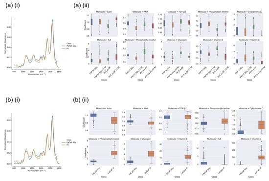 Examples of (i) fitting of mean spectra and (ii) CLS regression coefficients for (a) PNT1A and (b) LNCaP cell lines in which non-zero regression coefficients were observed (i) PNT1A and (ii) LNCaP cell lines in the fingerprint region using CLS regression. All regression coefficients have been normalised to the sham-irradiated (0 Gy) control for each cell line.