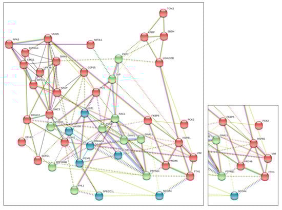 The graphical representation of the inferred network (Figure 1), weighted by protein interactions, provided a detailed view of the putative functional linkage among the 51 proteins used as input and FTH1, facilitating the comprehension of the modularity analysis in biological processes. The analysis generates a putative protein–protein interaction score. We sorted interactions by applying a score threshold of 0.3 and being FTH1 interactors.